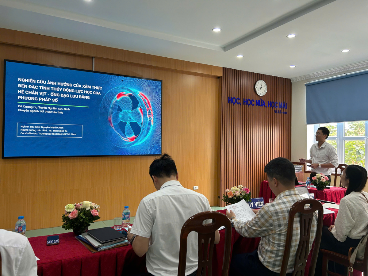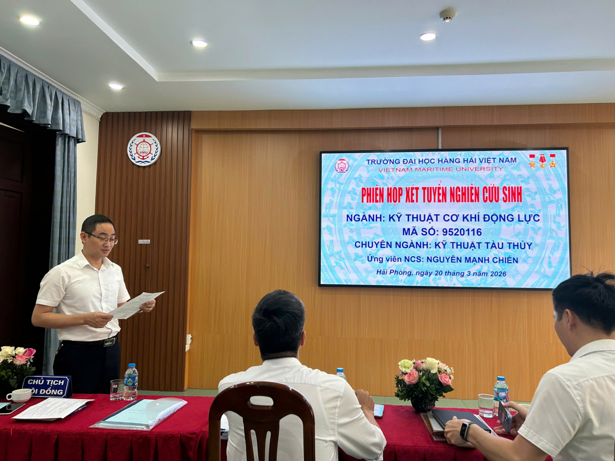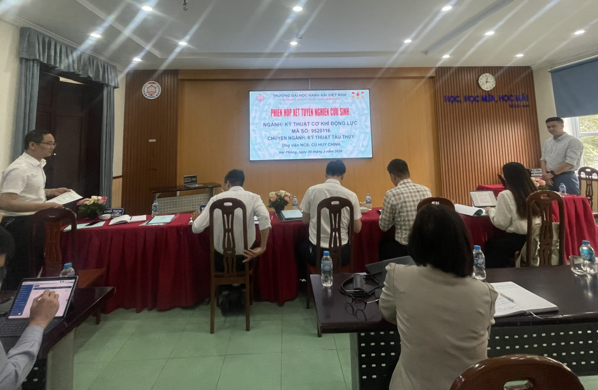Chiều ngày 20/03/2026, tại phòng 204 – A6 - Viện Đào tạo Sau đại học, trường Đại học Hàng hải Việt Nam, đã diễn ra buổi họp xét tuyển NCS chuyên ngành Kỹ thuật tàu thủy khóa 2026-2029 cho 03 ứng viên với các đề tài nghiên cứu của luận án như sau: