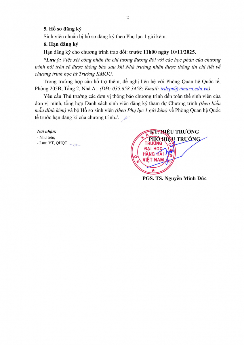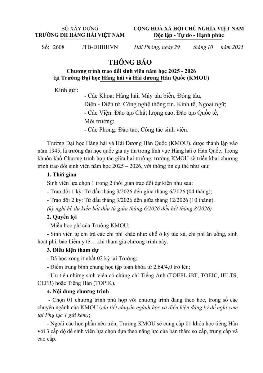 THÔNG BÁO Chương trình trao đổi sinh viên năm học 2025 - 2026 tại Trường Đại học Hàng hải và Hải dương Hàn Quốc (KMOU)(29/10/2025)