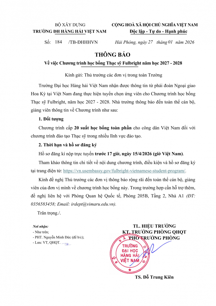 Thông báo Về việc Chương trình học bổng Thạc sỹ Fullbright năm học 2027 - 2028(28/1/2026)