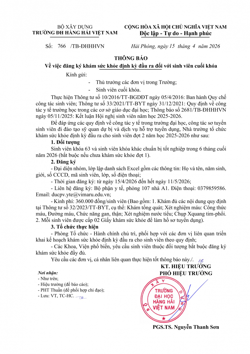 Thông báo Về việc đăng ký khám sức khỏe định kỳ đầu ra đối với sinh viên cuối khóa(15/4/2026)