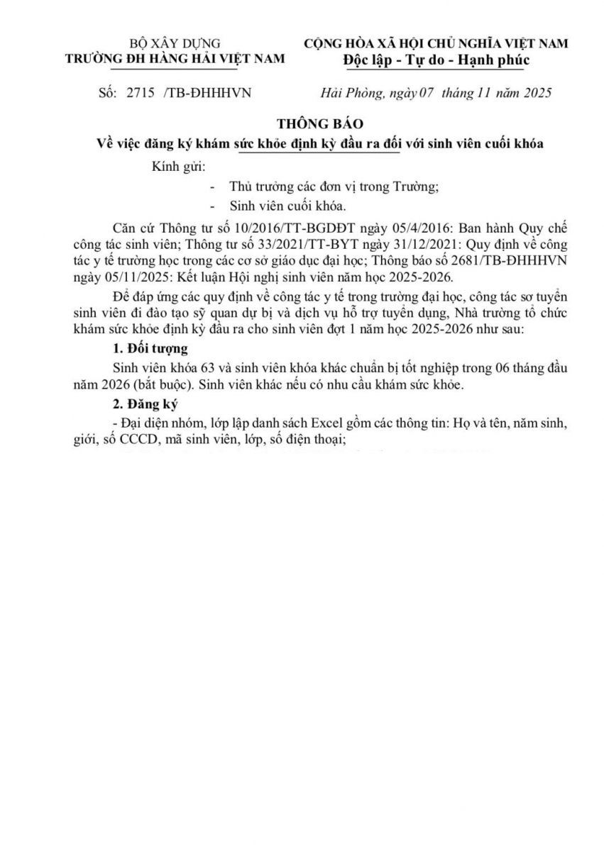 Thông báo về việc khám sức khỏe định kỳ đầu ra đối với sinh viên cuối khóa(11/10/2025)