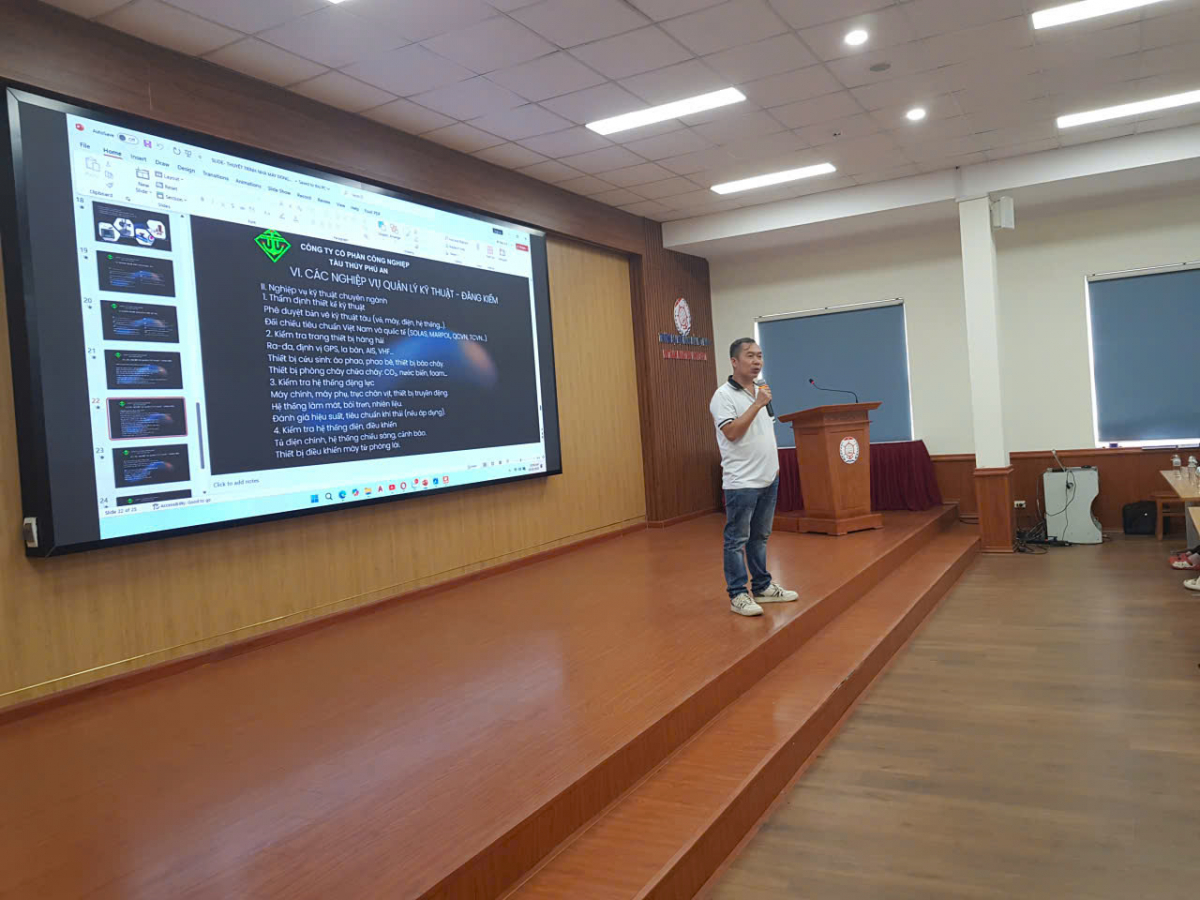 Tiếp nối chương trình, ông Thành đã trình bày về quy trình sản xuất và quản lý trong một dự án đóng tàu hiện đại, đồng thời giới thiệu đến sinh viên những công nghệ mới đang được ứng dụng như thiết kế 3D, mô phỏng thủy động lực học và tự động hóa trong thi công. Ông cũng chia sẻ nhiều ví dụ thực tế từ các dự án mà Công ty Ngọc Mai đang triển khai, giúp sinh viên hiểu rõ hơn về môi trường làm việc thực tế và yêu cầu nghề nghiệp.