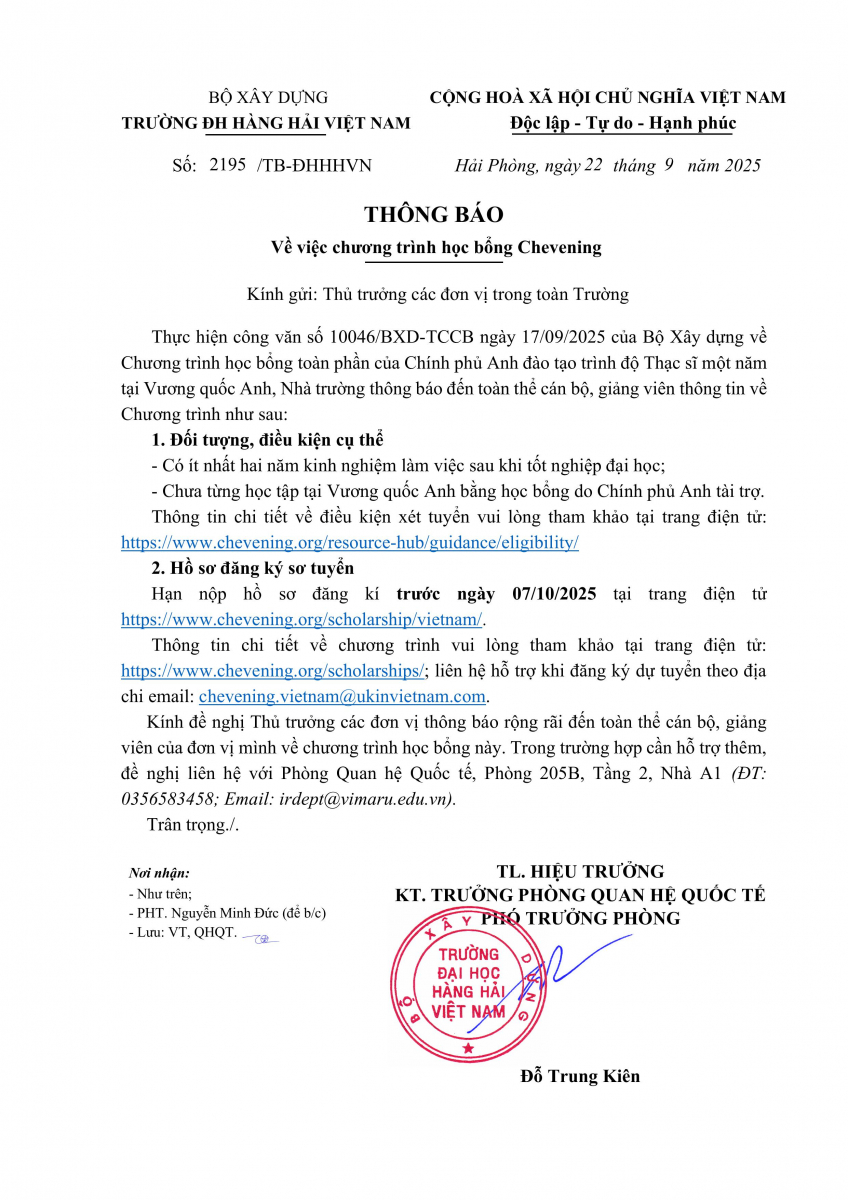 Thông báo về chương trình học bổng Chevening(22/9/2025)