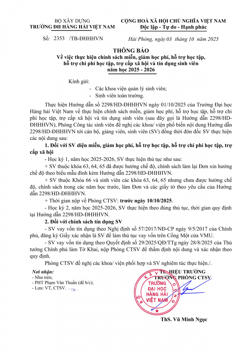 Thông báo Về việc thực hiện chính sách miễn, giảm học phí, hỗ trợ thực tập, hỗ trợ chi phí học tập, trợ cấp xã hội và tín dụng sinh viên năm học 2025 - 2026(6/10/2025)